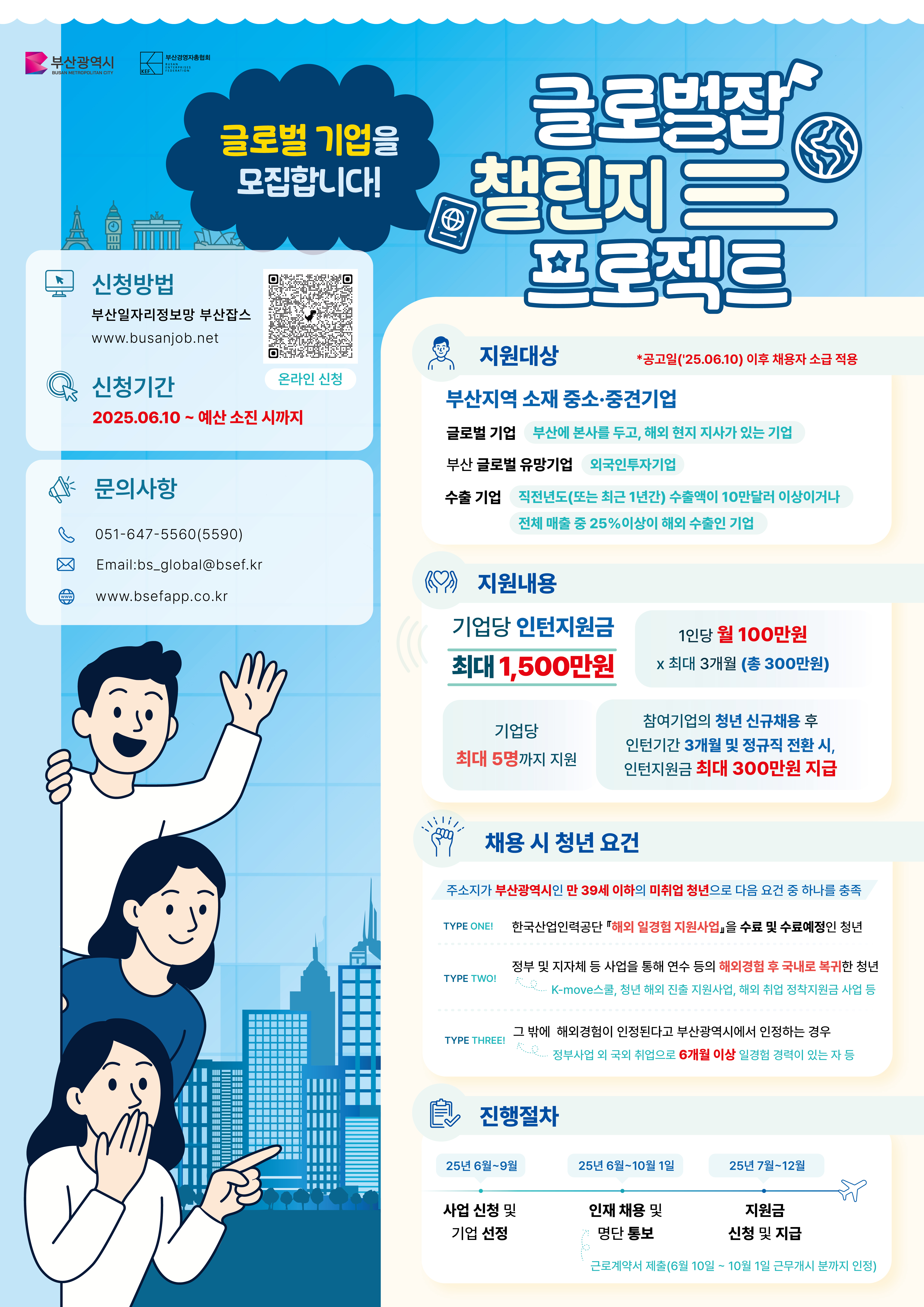 부산광역시와 (사)부산경영자총협회는 글로벌 역량을 갖춘 청년의 부산지역 정착 및 고용 촉진을 위해 「2025 부산청년 글로벌잡(JOB) 챌린지 프로젝트 사업」을 다음과 같이 시행하오니, 부산지역 글로벌 기업의 많은 참여 바랍니다.