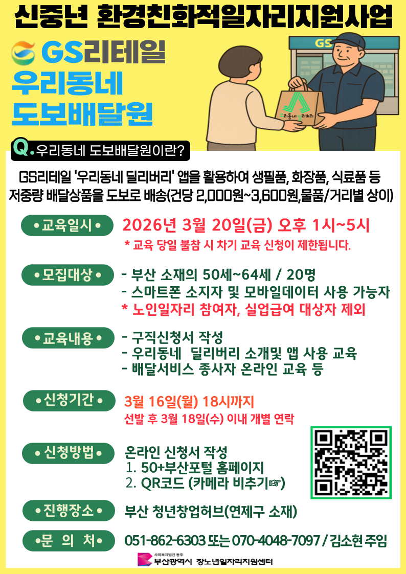 ❍ 신중년 환경친화적일자리지원사업 "GS리테일-우리동네 도보배달원" 참여자 모집