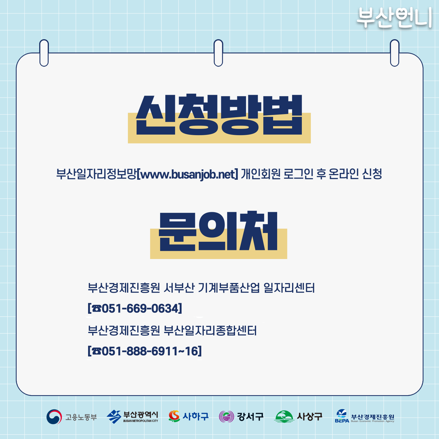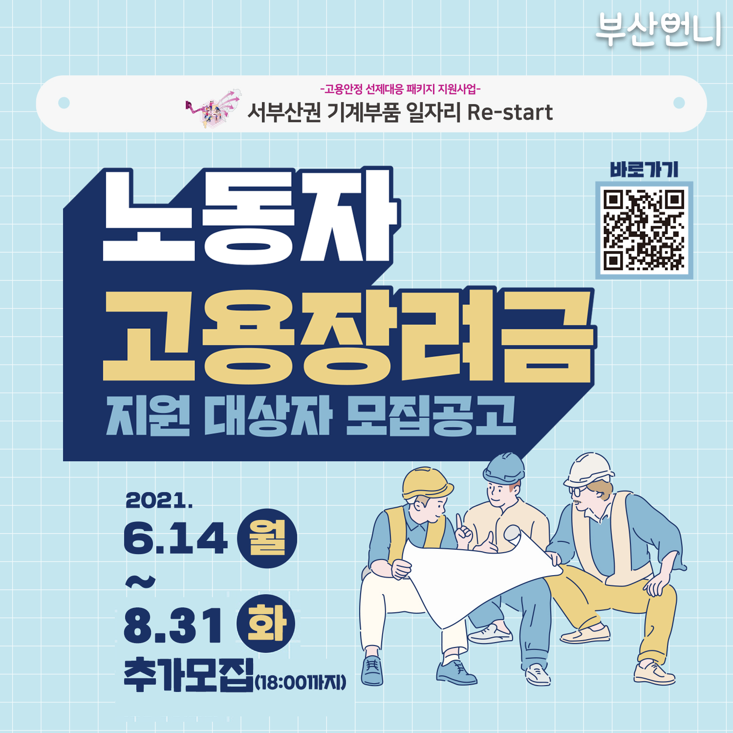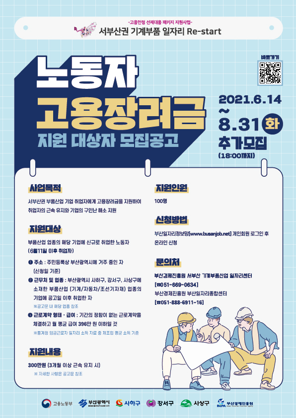 (재)부산경제진흥원은 고용노동부와 부산광역시 컨소시엄(부산광역시, 사하구, 강서구, 사상구)이 주관하는 2021년『고용안정 선제대응 패키지 지원사업』의 일환으로 서부산권 부품산업(기계ㆍ자동차ㆍ조선기자재) 에 종사하는 노동자의 고용안정을 지원하기 위하여『서부산권 부품산업(기계ㆍ자동차ㆍ조선기자재)』노동자 고용장려금 지원 대상자를 추가 모집하오니 많은 신청 바랍니다.