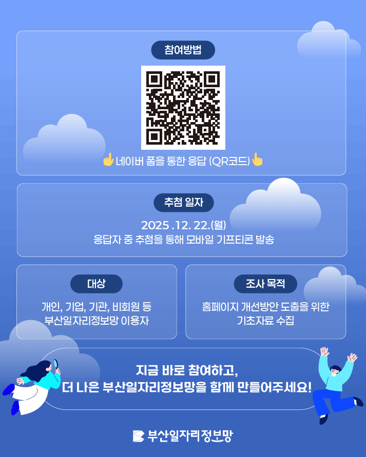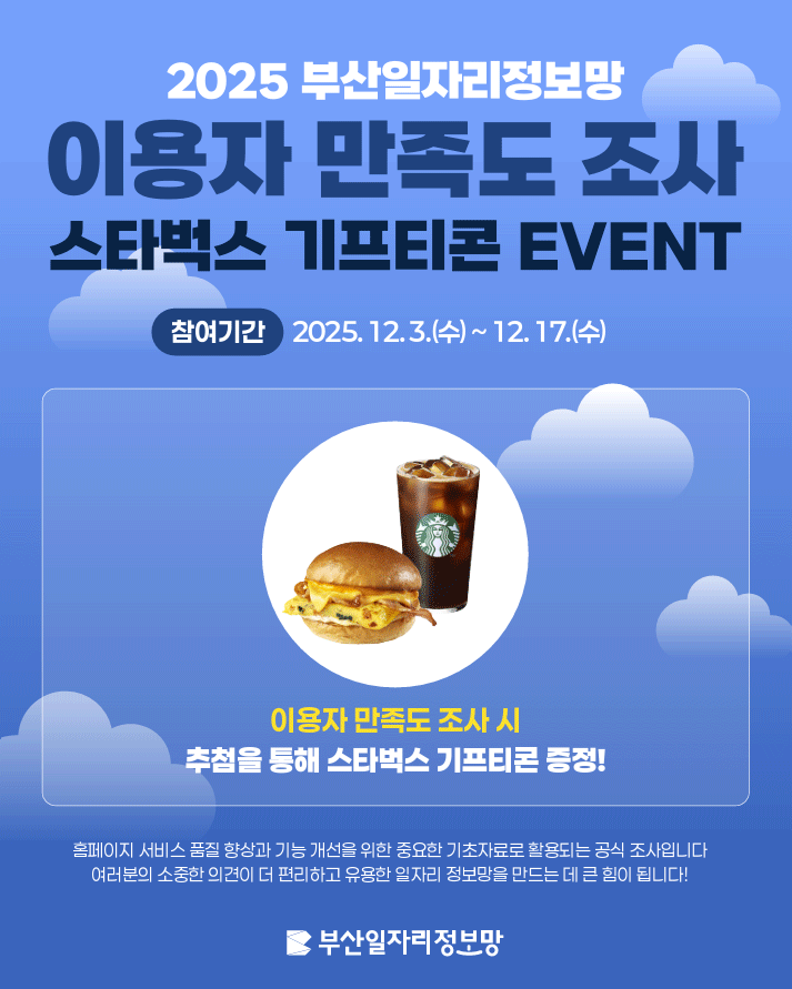 2025 부산일자리정보망 만족도 조사 이벤트 올해도 부산일자리정보망을 찾아주시고 응원해주신 여러분께 감사합니다🎅 여러분이 들려주시는 의견이 모여 더 나은 부산일자리정보망을 만드는 데 큰 힘이 됩니다. 부산일자리정보망 이용 유무에 상관없이 성실히 답변해주신 분들께 추첨을 통해 스타벅스 기프티콘을 드리니 많은 참여 부탁드립니다☕ 따뜻한 연말 되세요🎀 ------------------ 🌟 조 사 명 : 2025 부산일자리정보망 이용자 만족도 조사 🌟 조사대상 : 부산일자리정보망 이용자(개인‧기업‧기관‧비회원) 🌟 조사기간 : 2025. 12. 3.(수) ~ 12. 17.(수) / 15일간 🌟 조사목적 : 홈페이지 개선방안 도출을 위한 기초자료 수집 🌟 조사방법 : 온라인 조사(Web Survey) 🌟 조사내용 🌟 응답자 유형(연령, 성별, 회원유형), 이용현황, 만족도 평가 등 19개 문항 🎇 만족도조사 참여 바로가기 🎇 (이미지를 클릭하시면 네이버 폼 응답화면으로 이동합니다)