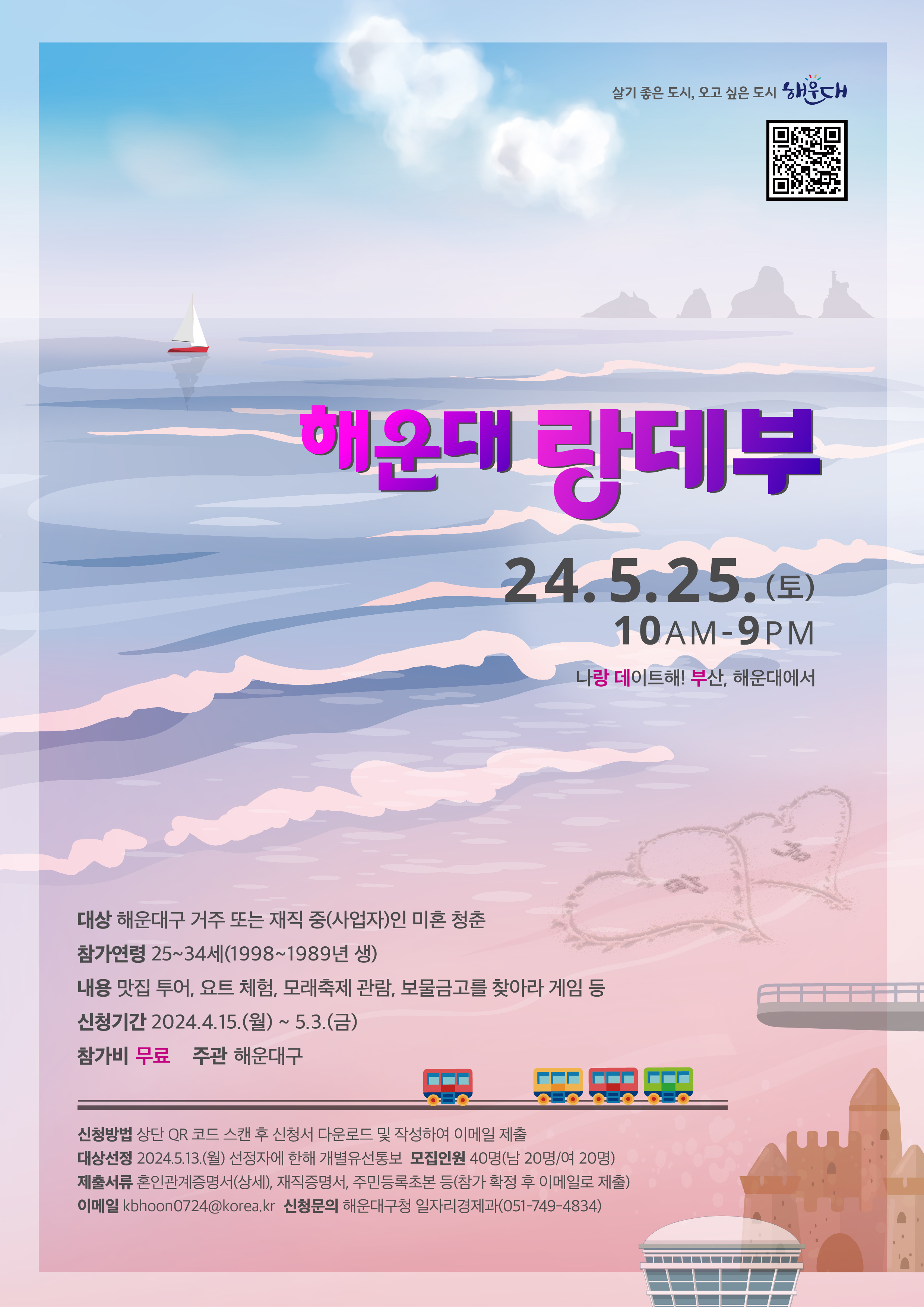 행사는 5월 25일 토요일 오전 10시부터 오후 9시까지 진행된다. 인위적인 매칭 대신 조별 활동으로 자연스럽게 대화하며 친해질 수 있는 내용으로 준비했다. 동백섬 누리마루APEC하우스에서 게임을 즐기고, 해리단길 맛집 투어, 모래축제 관람, 해변열차와 요트 탑승 등 해운대 곳곳을 누비며 새로운 사람과 다양한 체험을 할 수 있다. 해운대구 거주자나 관내 직장인, 사업자이면서 1989년~1998년생 미혼 청년 40명을 모집한다. 안전한 만남을 위해 혼인증명서와 범죄경력회보서를 제출해야 한다.