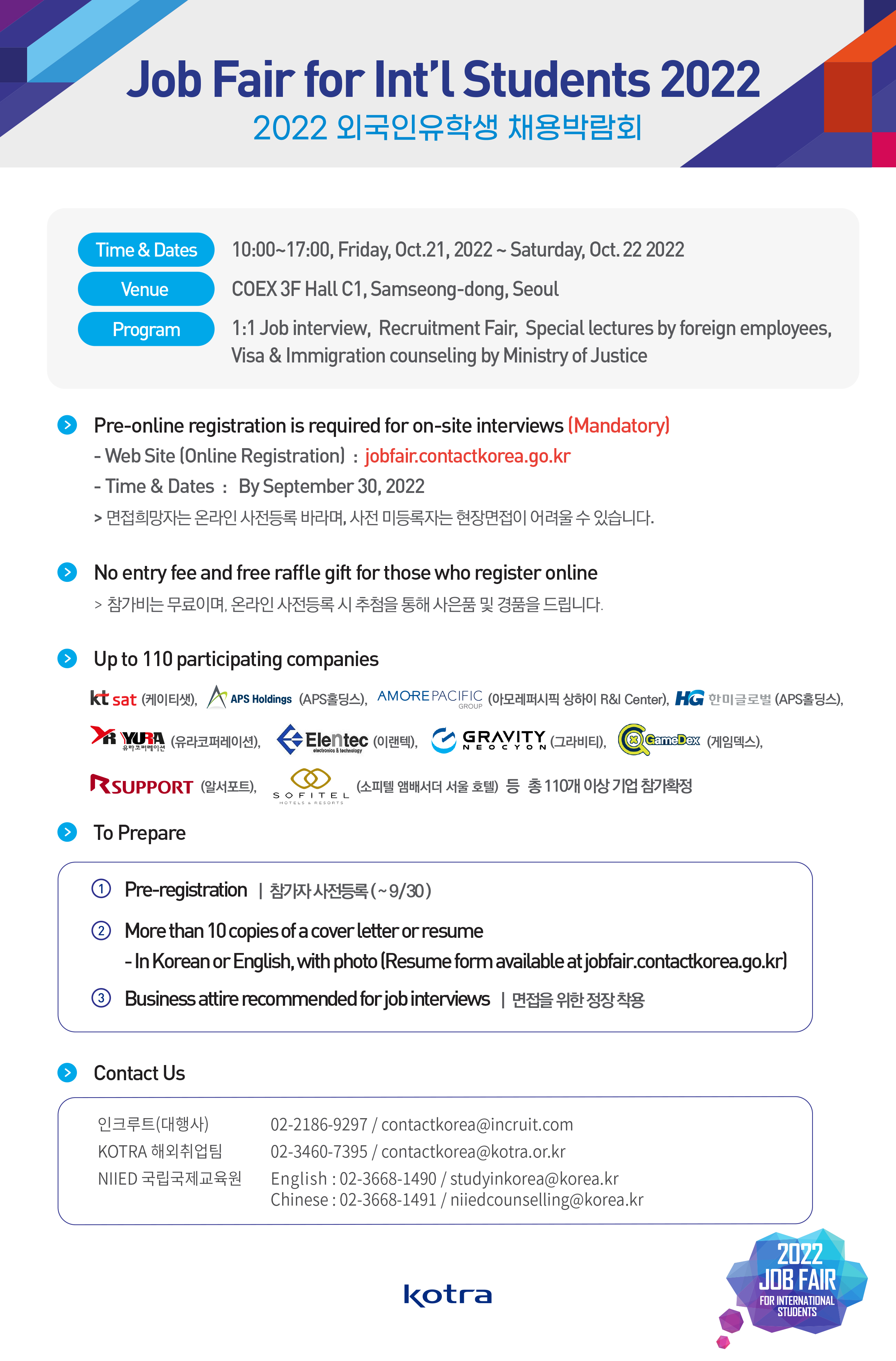 ○ 온라인 사전등록 : 2022.9.30.까지, http://jobfair.contactkorea.go.kr에서 신청