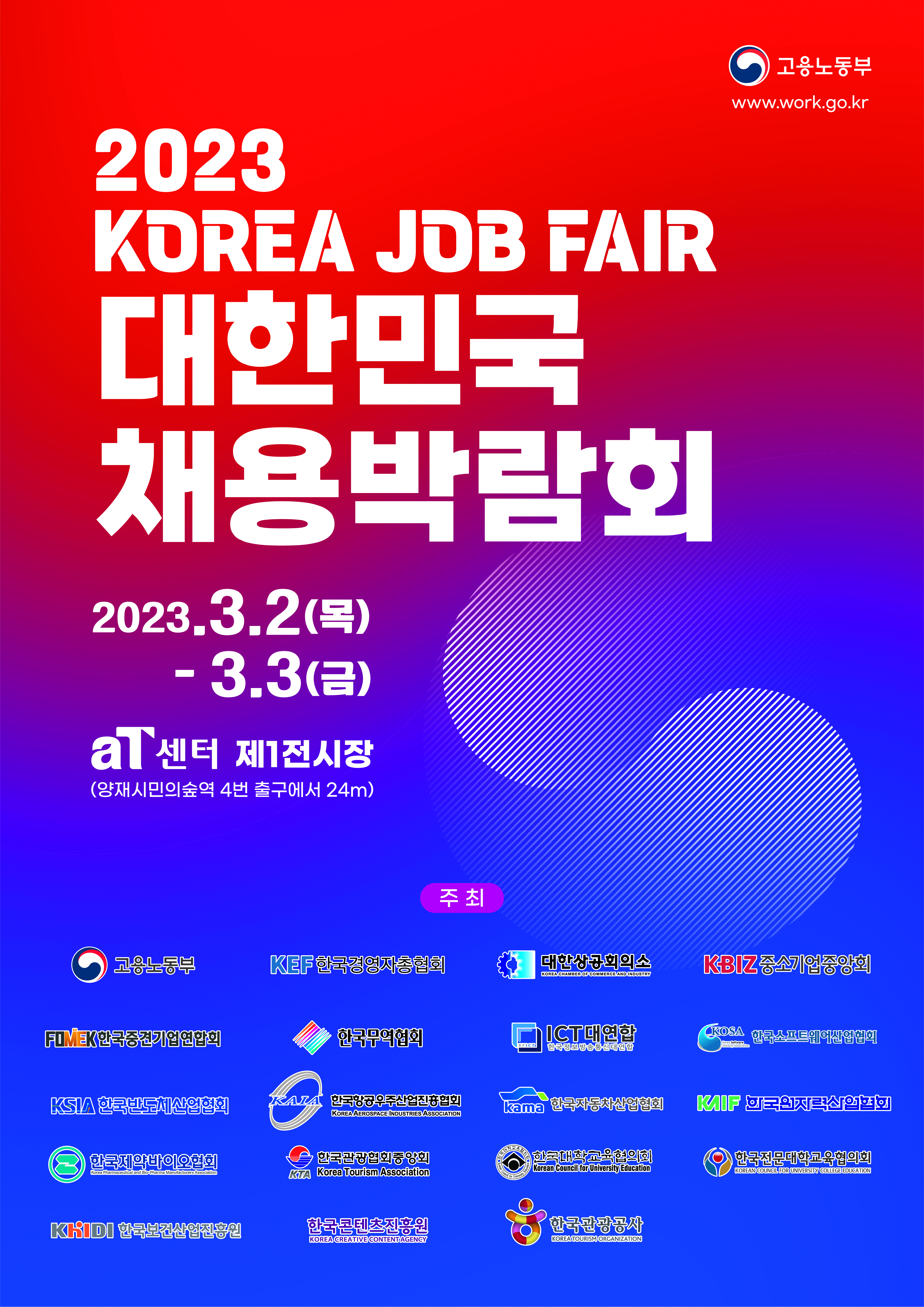 「2023 대한민국 채용박람회」는 올해 고용둔화 상황에 선제적으로 대응하고, 코로나19 이후 심화된 구인-구직 미스매치 현상을 적극 해소하기 위해 개최 되는 것으로, 정부가 한국경영자총협회 등 경제 5단체, 한국반도체산업협회 등 업종별 협회, 한국대학교육협의회 등 경제 5단체, 한국반도체산업협회 등 업종별 협회, 한국대학교육협의회 등 교육계와 함께 추진하는 대규모 행사입니다.