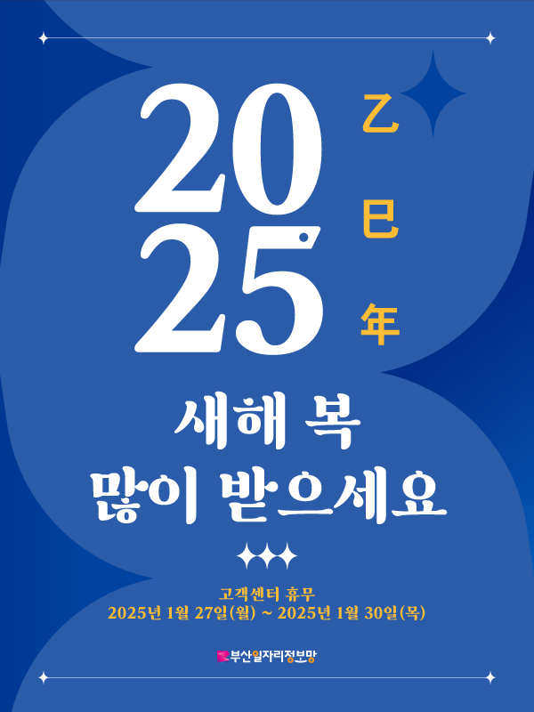 | 제목 | [공지] 2025 부산일자리정보망 설 연휴 고객센터 휴무 안내 | ||||