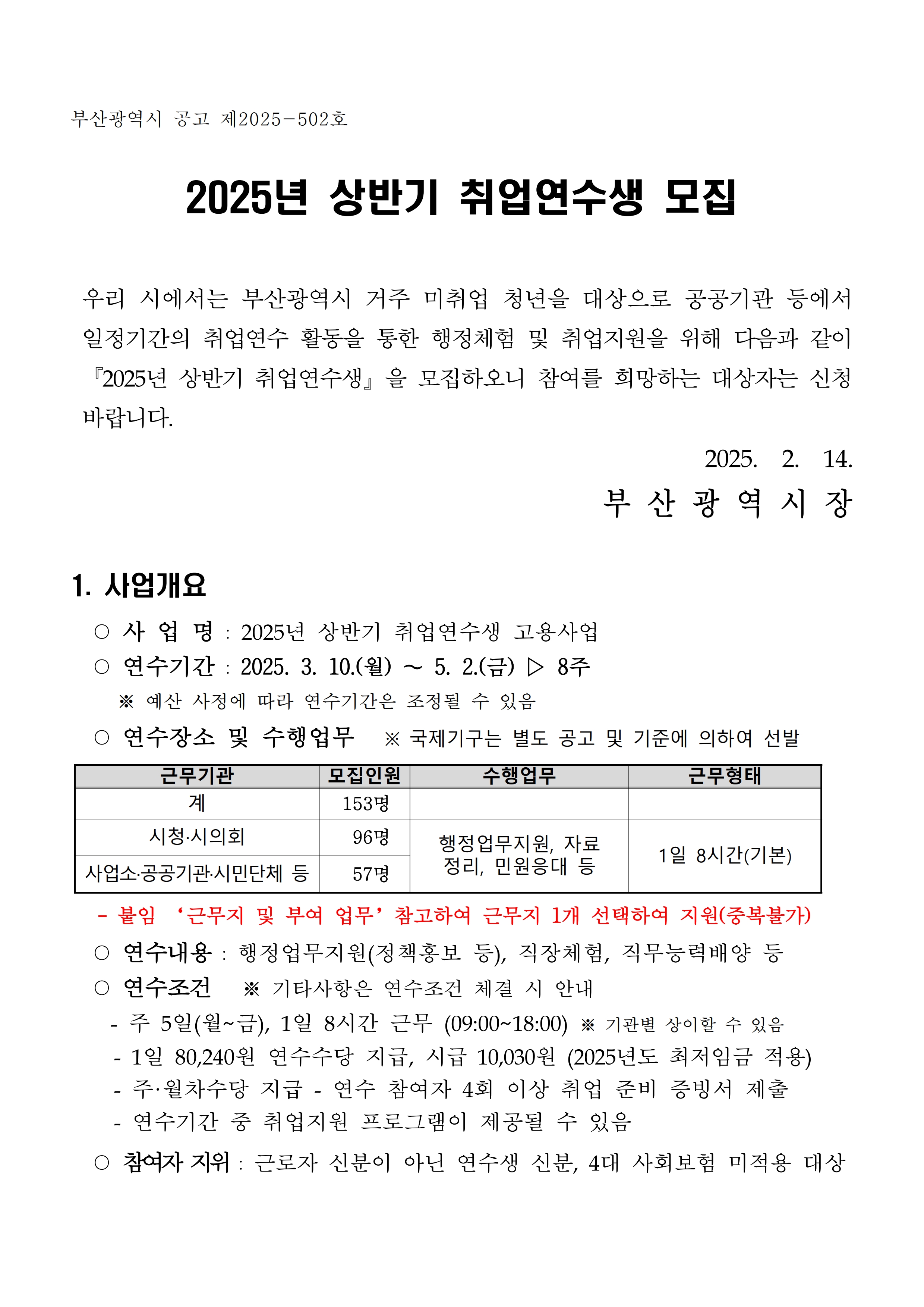 우리 시에서는 부산광역시 거주 미취업 청년을 대상으로 공공기관 등에서 일정기간의 취업연수 활동을 통한 행정체험 및 취업지원을 위해 다음과 같이『2025년 상반기 취업연수생』을 모집하오니 참여를 희망하는 대상자는 신청 바랍니다. 2025. 2. 14.부산광역시장