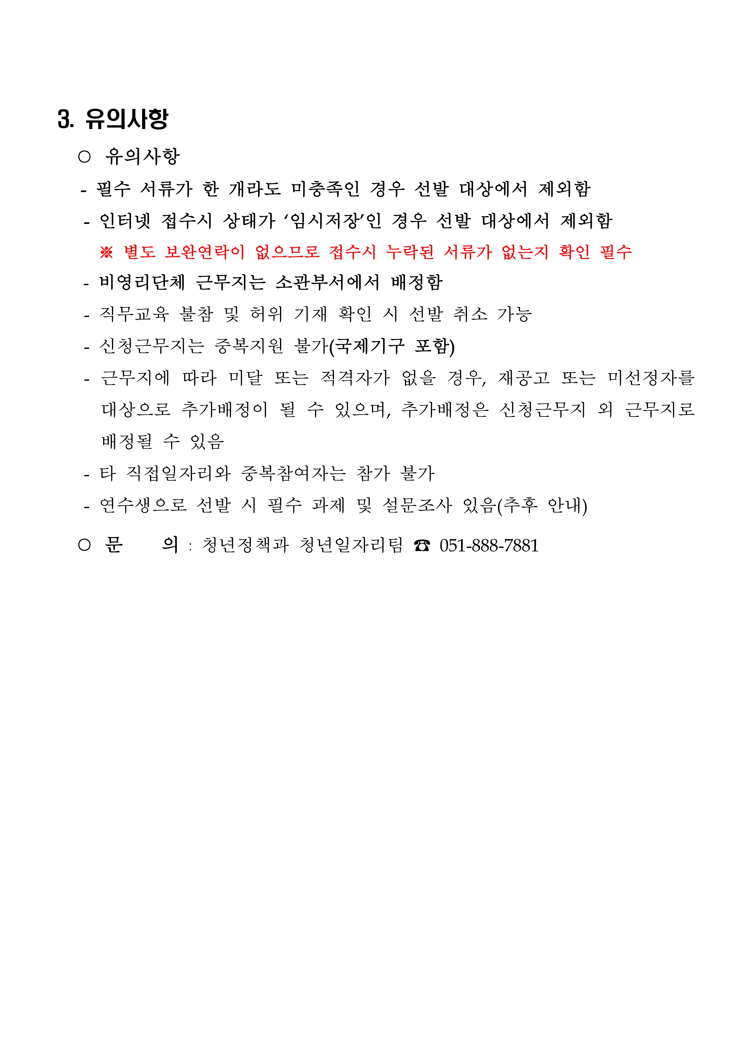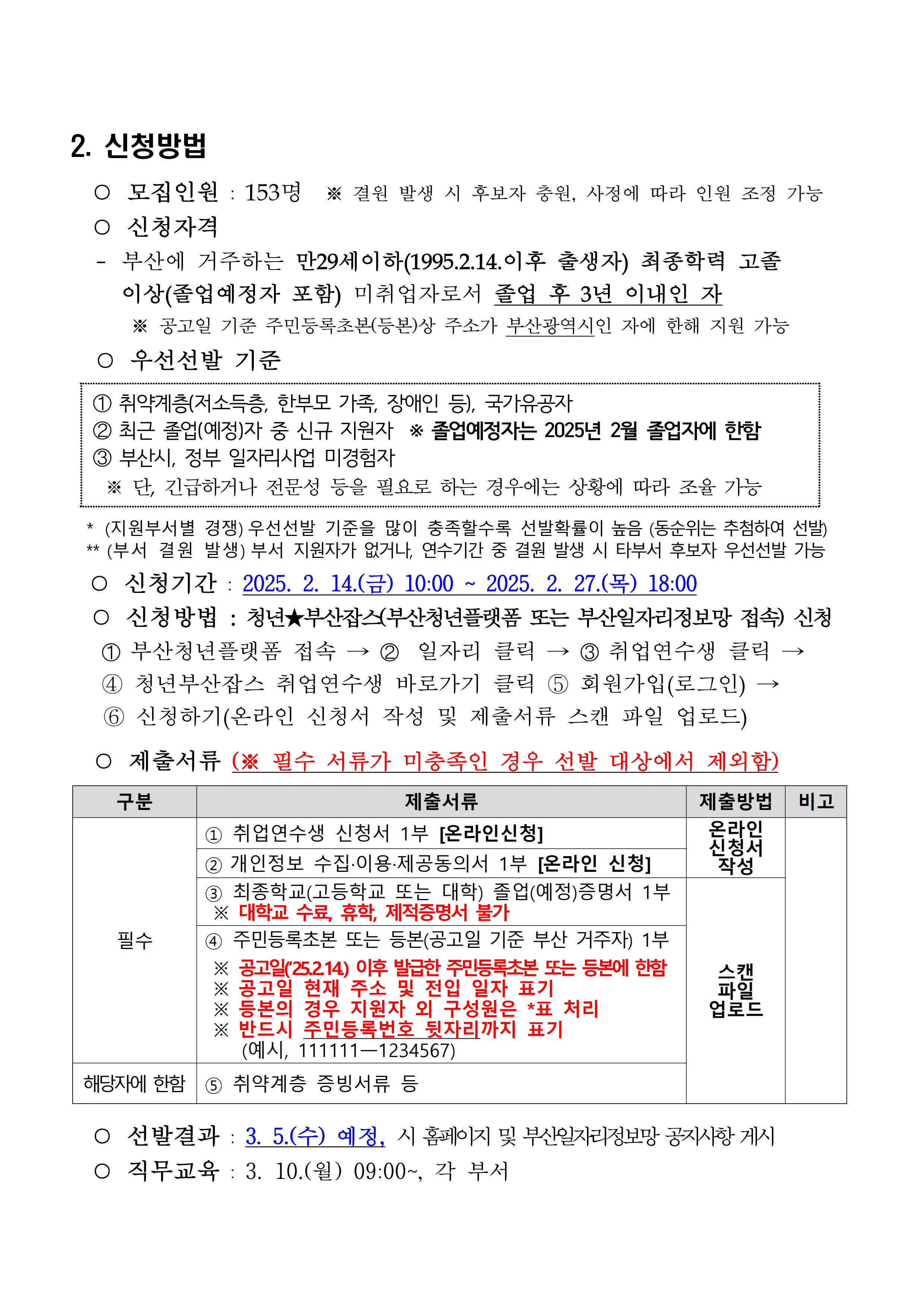 ■ 모집개요 ○ 모집인원 : 153명 ○ 모집기간 : 2025. 2. 14.(금) 10:00 ~ 2. 27.(목) 18:00 ○ 연수기간 : 2025. 3. 10.(월) ~ 5. 2.(금) ▷ 8주 ※ 사정에 따라 연수기간은 조정될 수 있음 ○ 연수장소 - 시청, 시의회, 사업소, 공공기관, 비영리단체 등 공고문 참조하여 선택지원(중복불가) ○ 연수내용 : 행정업무지원(정책홍보 등), 직장체험, 기업탐방, 직무능력배양 등 ○ 모집방법 : 온라인 접수(청년부산잡스) ○ 신청자격 : 공고일 기준 부산에 거주하는 만29세 이하 최종학력 고졸이상(졸업예정자 포함) 미취업자로서 졸업 후 3년 이내인 자 ○ 선발결과 : ′25.3.5.(수), 시 홈페이지·부산일자리정보망 공지사항 게시 ○ 기타사항 : 공고문 참조 * 국제기구 인턴십과 중복지원 불가하며, 자세한 사항은 공고문 참조 바랍니다.