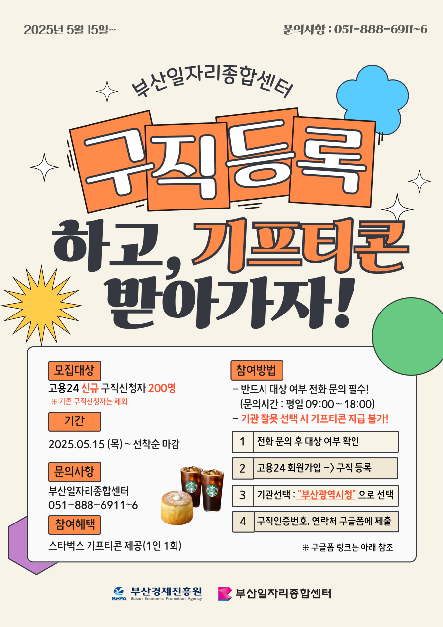 ![]() < 신규 구직신청서 작성하고 커피 기프티콘 받아가자! > 1. 기간 : 2025.05.15(수)~선착순 마감 2. 대상 : 고용24 신규 구직신청자 선착순 200명 ※ 기존 구직신청자는 제외 ※ 구직 신청 대상 확인을 위해 반드시 사전 연락 필수 ☎051-888-6911~6 ※ 부산일자리종합센터 운영시간 : 평일 (월~금) 09:00 ~ 18:00 까지 3. 등록방법 ① 전화 문의 후 대상 여부 확인 ② 고용24 회원가입 -> 구직 등록 ※ 첨부된 메뉴얼 확인! ③ 기관 선택 : "부산광역시청" 으로 선택 ※ 기관 잘못 선택 시 기프티콘 지급 불가 ④ 구직인증번호(KJBA로 시작해야 신청가능), 연락처 구글폼에 입력 후 제출