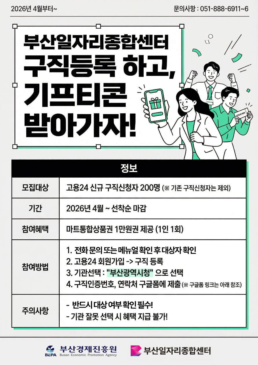 < 부산일자리종합센터로 구직등록하고, 기프티콘 받아가자! > 1. 기간 : 2026. 4. 1.(수) ~ 선착순 마감 2. 대상 : 고용24 신규 구직신청자 선착순 200명 ※ 기존 구직신청자는 제외 ※ 구직 신청 대상 확인을 위해 반드시 메뉴얼 확인 또는 전화문의 필수 ☎051-888-6911~6 ※ 부산일자리종합센터 운영시간 : 평일 (월~금) 09:00 ~ 18:00 까지 3. 등록방법 ① 전화 문의 또는 메뉴얼 확인 후 대상자 확인 ② 고용24 회원가입 → 구직 등록 ※ 첨부된 메뉴얼 확인! ③ 기관 선택 : "부산광역시청" 으로 선택 ※ 기관 잘못 선택 시 기프티콘 지급 불가 ④ 구직인증번호(KJBA로 시작해야 신청가능), 연락처 구글폼에 입력 후 제출